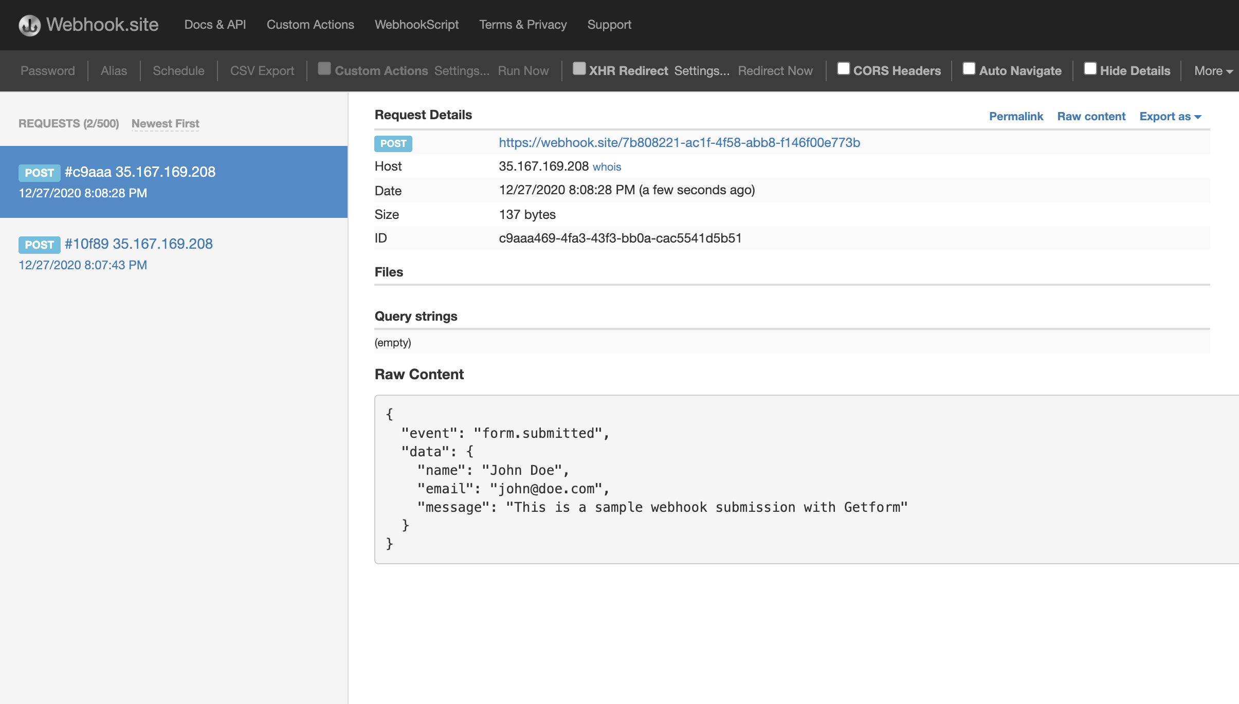 Once you have set up and saved your webhook, it’s ready to transmit data. Here’s what happens next:Submit a new entry through your form to test the webhook. The data should be posted automatically to the URL you specified, showing up in the format you have configured.Check the endpoint or the service you are using to capture the webhook data (such as webhook.site) to see the incoming submissions in real time.